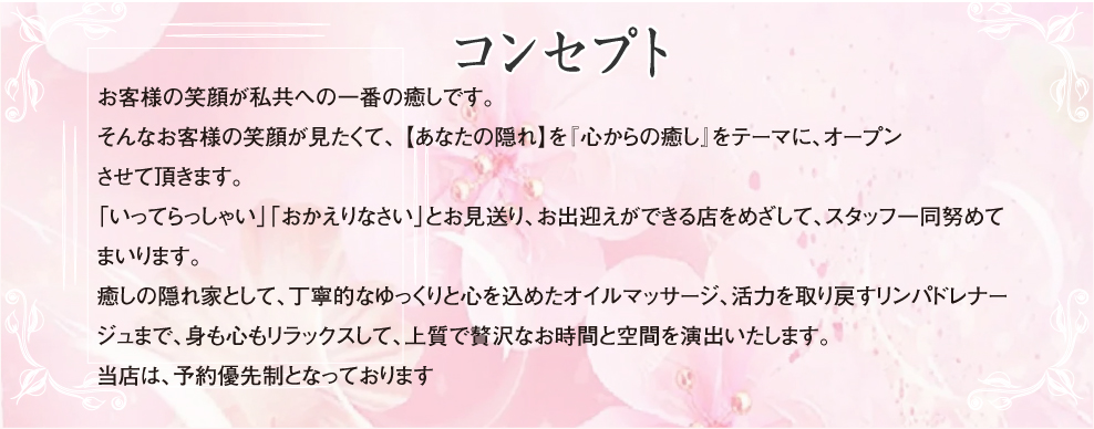 親しみやすくお客様の大切なお時間を癒しの空間として満足いただけることお約束致します。。
